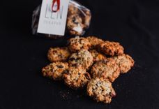 200 г • Мука пшеничная высшего сорта, овсяные хлопья, яйцо, масло сливочное 84%, сахар, соль морская, семя льна, клюква, фундук, шоколадные капли